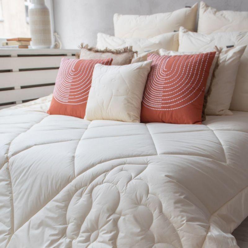 Naturalna, ciepła i zdrowa kołdra wełniana, połączenie dwóch w 100% naturalnych składników. Wypełnienie stanowi 100% czysta żywa wełna. Tkanina wierzchnia to 100% tkanina bawełniana typu Inlet.